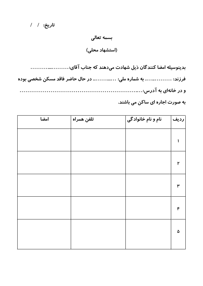 این فرم نمونه ار استشهادنامه محلی می باشد که برای اعلام عدم وجود مسکن برای شخص و اسکان به صورت استیجاری تنظیم شده است. فایل ورود قابل دانلود و ویرایش می باشد. و لیست جدولی شهادت دهندگان می تواند بیشتر نیز شود.